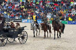 Anfang Oktober feierte das Haupt – und Landesgestüt Marbach seine einhunderste Hengstparade. Neben den üblichen Schaubildern, wie der „weißen Stutenherde “ mit den dazu gehörigen dunklen Fohlen, den bis zu zehnspännigen Kutschen, der „ungarischen Post “, den römischen Streitwagen, den eleganten Hengstquadrillen wurde dem Publikum auch die Darstellung einer Jagdgesellschaft um das Jahr 1900 geboten. Dazu gesellte sich die Hardt-Meute mit ihren Hundeführen und ihren Jagdhunden. Anschließend fuhr eskortiert von drei Reitern des „ Württembergischen Ulanenregiments König Wilhelm I “ Königin Charlotte, die oben genanntes Regiment 1891 in 2. Württembergisches Ulanenregiment 20 umbenannte in einer offenen Kutsche in die vollbesetzte Arena. Martin Hasler, Mitglied des Reitervereins Bad Friedrichshall und seit ein paar Jahren aktives Mitglied der Württembergische Ulanen durfte am Sonntag, den 05.10.2025 mit seiner 6-jährigen Schimmelstute „ Cataleya “ Teil dieser Eskorte sein. Pferd und Reiter hatten sichtlich Spaß an dem ungewöhnlichen Auftritt und genossen ihn ausgiebigst.